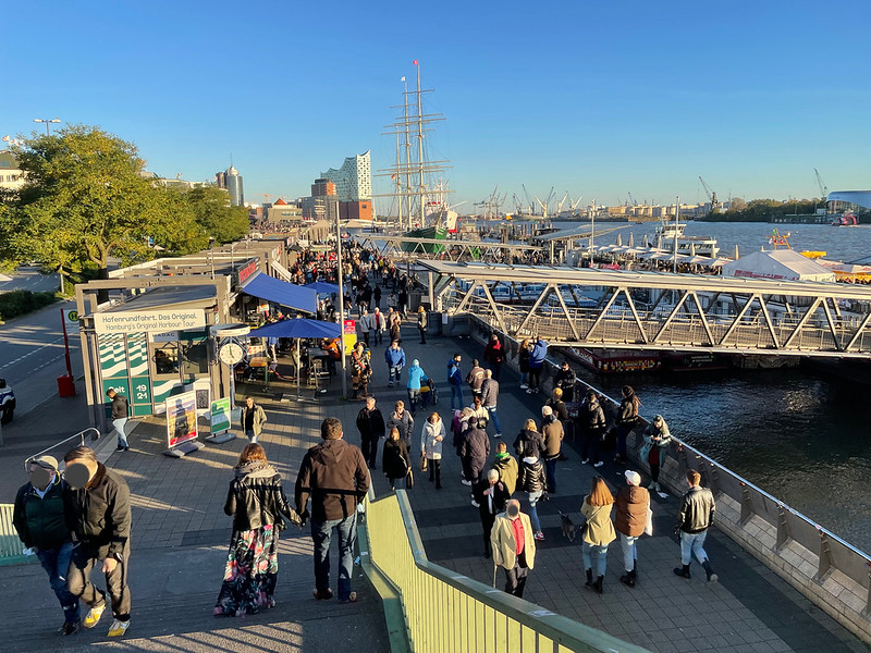 Um den Andrang der Menschen zu kanalisieren, wurde die Hafenpromenade im Zuge von Hochwassermaßnahmen verlängert und führt nun von der Brücke 10, bzw. in der Verlängerung vom Fischmarkt aus, auf einer Ebene bis zur Elbphilharmonie. Von ihr gehen die Brücken zu den Landungsbrücken ab. Da die Promenade ebenfalls mit Aufbauten versehen ist, die sowohl dem Ticketverkauf als auch gastronomischen Zwecken dienen, führt das dazu, dass viele Menschen denken, dass sich die Landungsbrücken hier oben in der Nähe des Wahrzeichens befinden. Das ist jedoch nicht der Fall.